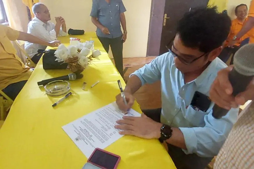 Ketua PK Partai Golkar Barambai, Bachtiar Effendi, menandatangani surat dukungan kepada Syarif Faisal menjelang Musda XI DPD Partai Golkar Batola. Foto: Kabar Kalsel
