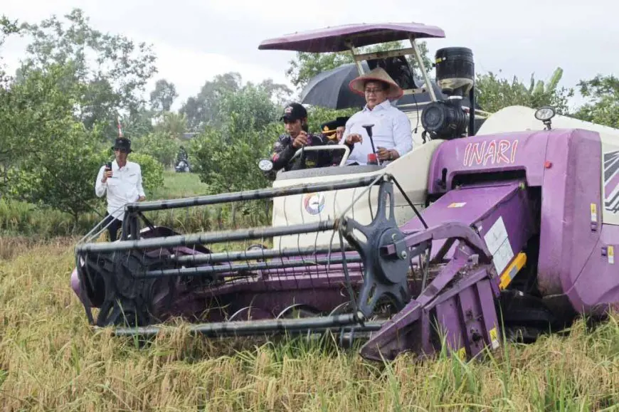 Wakil Menteri Transmigrasi, Viva Yoga Mauladi, mengoperasikan combine harvester ketika mengawali panen raya di Desa Karang Indah. Foto: Economic Travelling