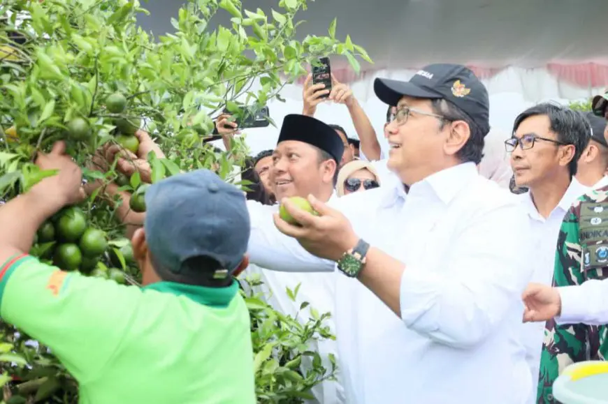 Ditemani Bupati H Bahrul Ilmi, Wakil Menteri Transmigrasi, Viva Yoga Mauladi, memanen jeruk di Desa Karang Indah yang menjadi bagian Kawasan Transmigrasi Cahaya Baru. Foto: Diskominfo Batola