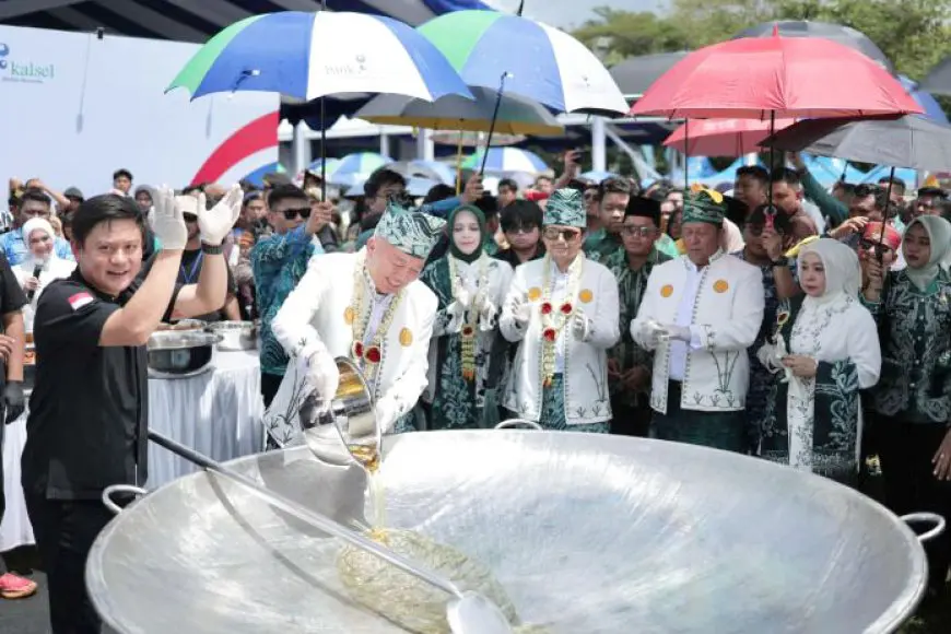 Gubernur Kalimantan Selatan, H Muhidin, memasukkan sambal masak habang dalam upaya pemecahan rekor makan besar yang menjadi rangkaian puncak perayaan Hari Jadi ke-66 Barito Kuala. Foto: MC Kalsel