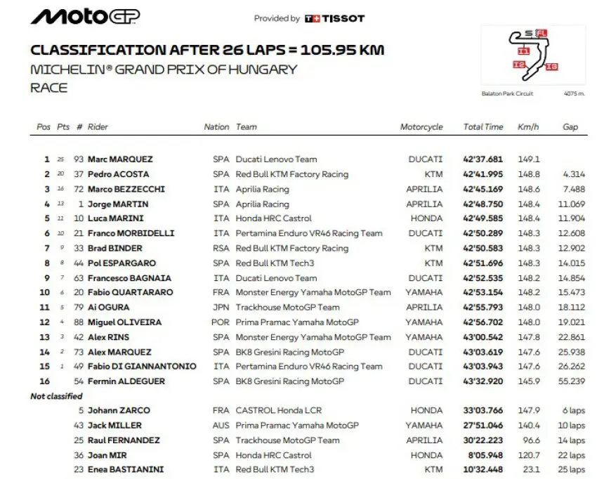 Adapun Alex Marquez mengoleksi 280 poin, disusul Francesco Bagnaia 228 poin yang finis ketujuh di Hungaria. Selanjutnya Marco Bezzecchi 197 poin di peringkat keempat dan Pedro Acosta 164 poin untuk melengkapi lima besar.