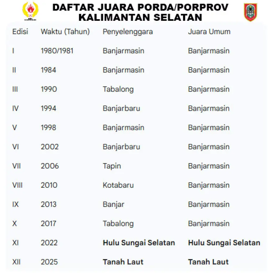 Diketahui sejak Porda/Porprov I digelar di akhir 1980, Banjarmasin sukses menjadi juara umum sebanyak sepuluh kali berturut-turut, sebelum ditelikung HSS di Porprov XI/2022.