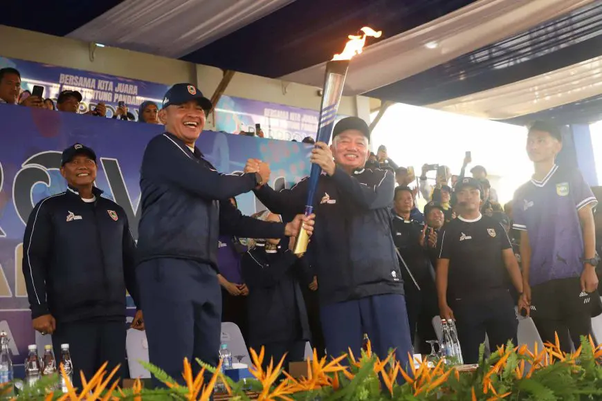 Gubernur H Muhidin menerima obor dari Bupati Tanah Laut Rahmat Trianto dalam opening ceremony Porprov XII Kalsel 2025 di Stadion Pertasi Kencana. Foto: Humas Porprov 2025