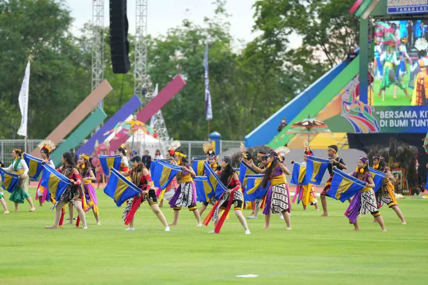 Penampilan tarian massal yang menampilkan beragam budaya dalam opening ceremony Porprov XII Kalsel 2025 di Stadion Pertasi Kencana, Pelaihari, Tanah Laut. Foto: Humas Porprov 2025